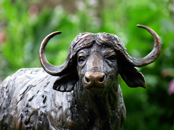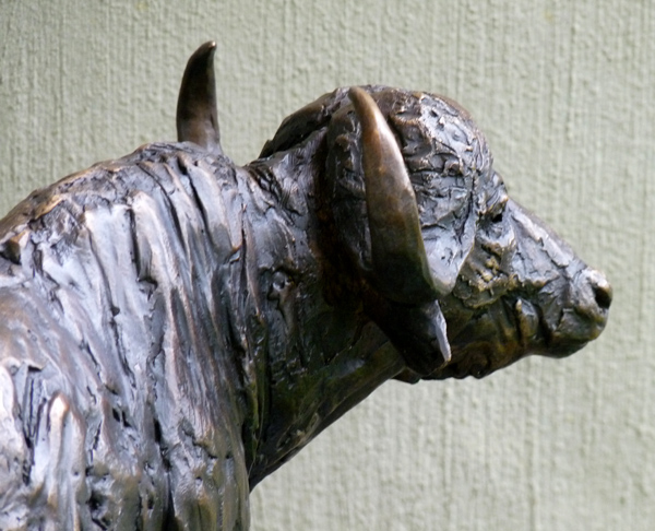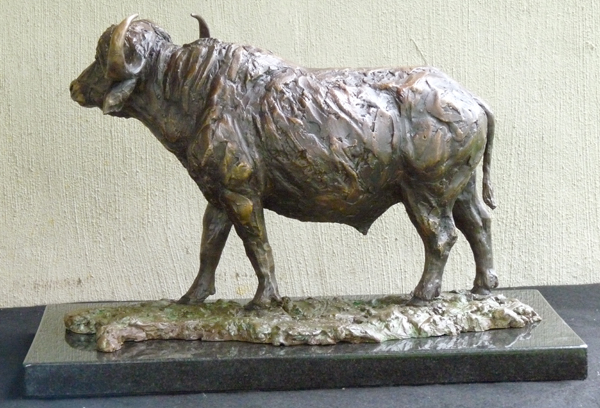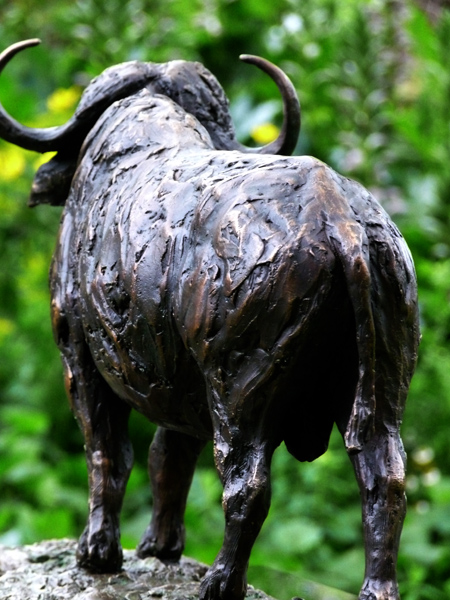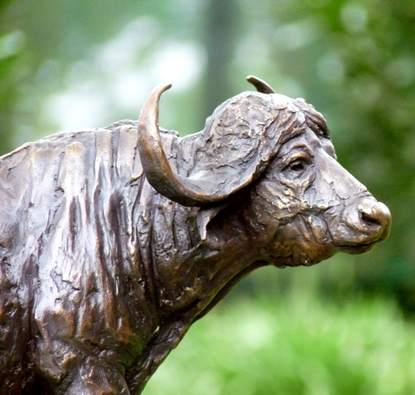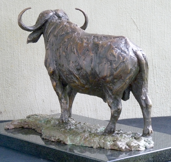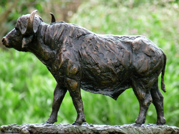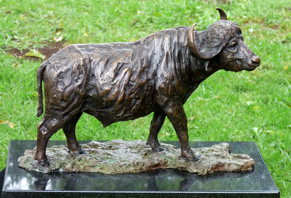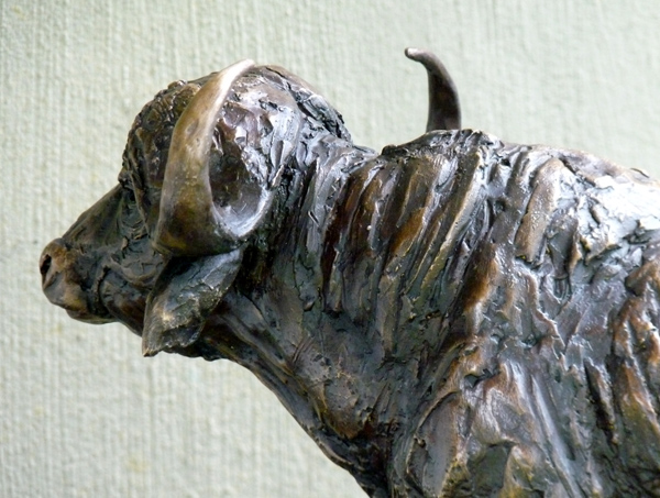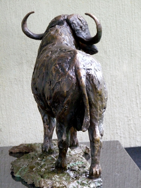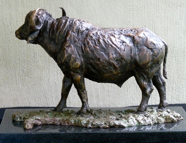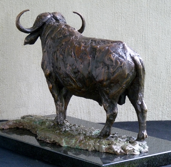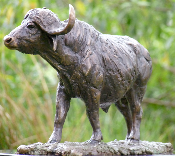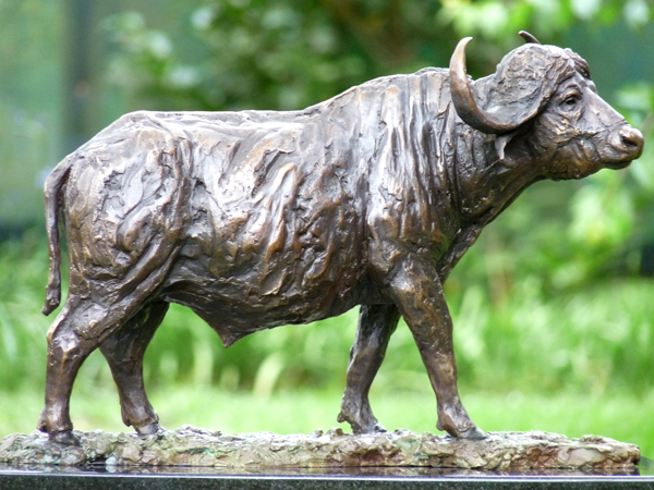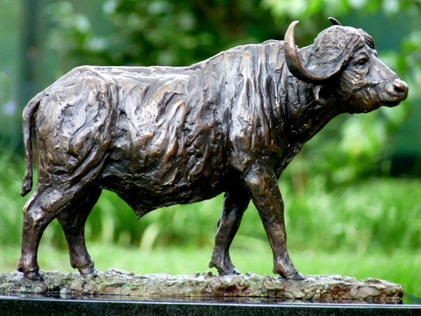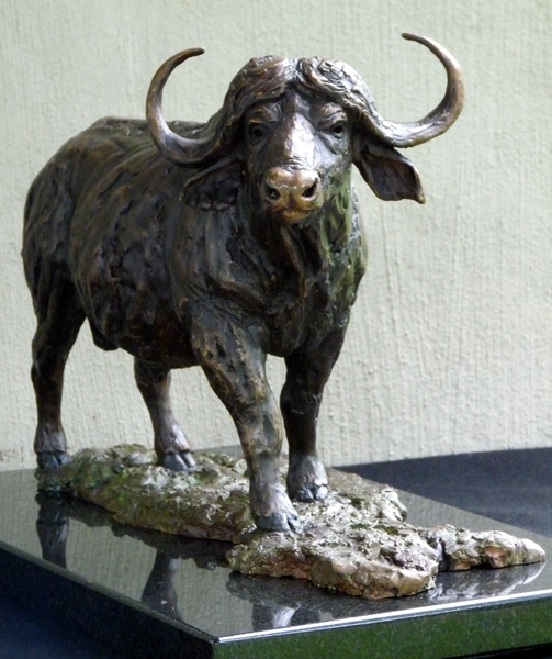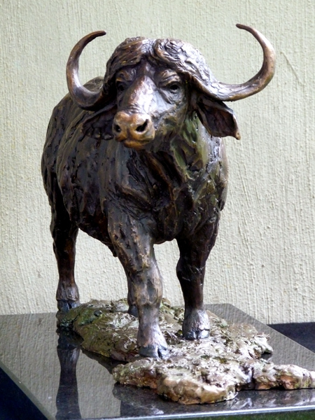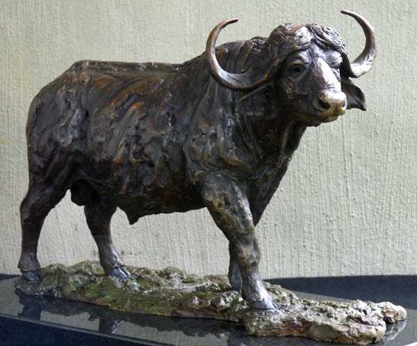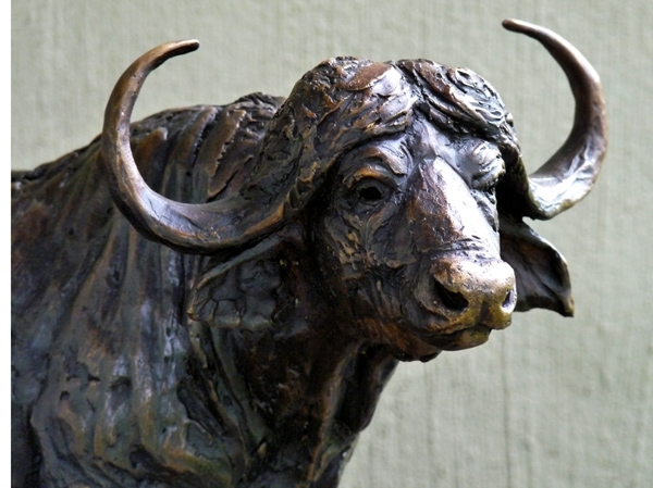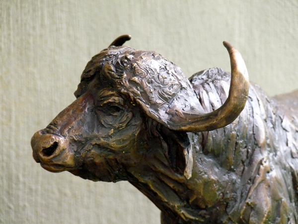 The Buffalo bull - one of the most feared animals in the wild. The old males are often seen alone, on the side of river beds. This is a sculpture of the Buffalo looking up from grazing.