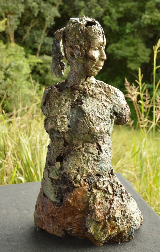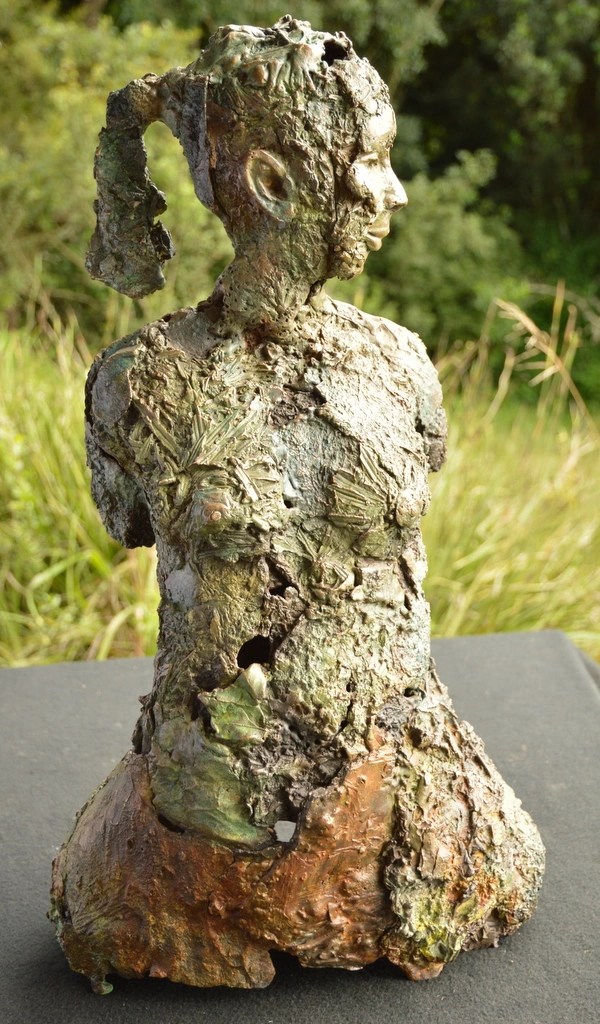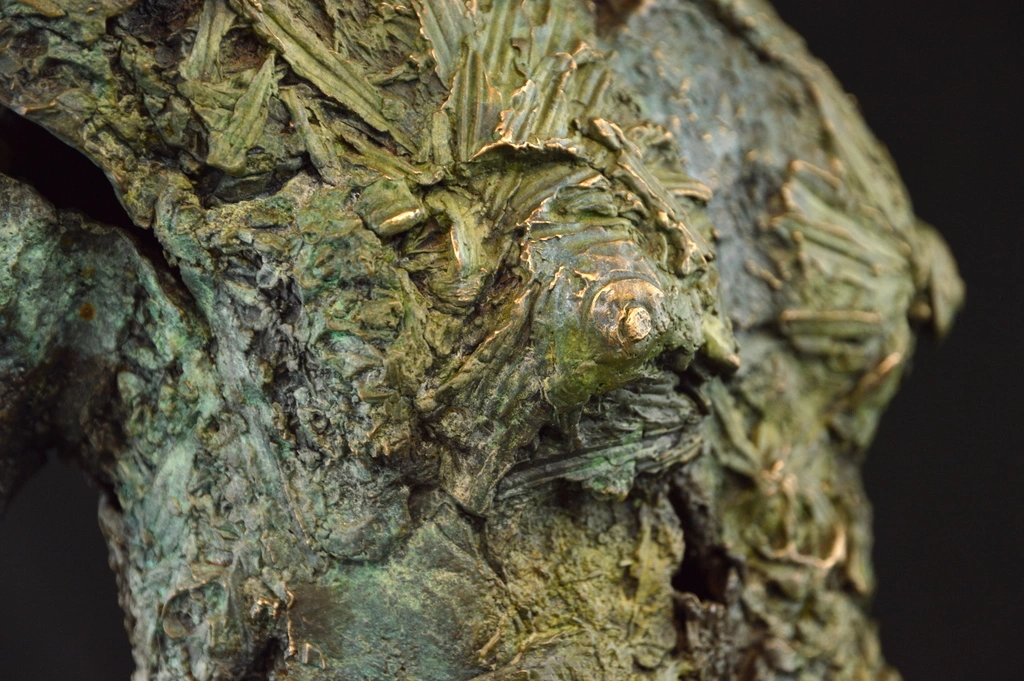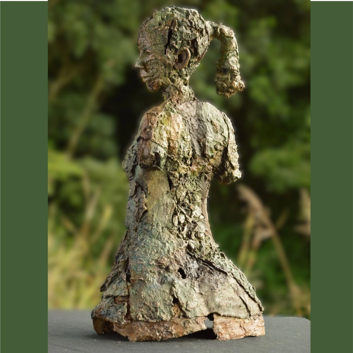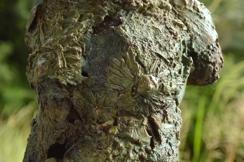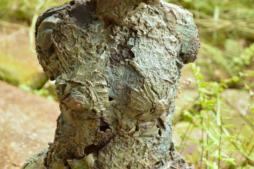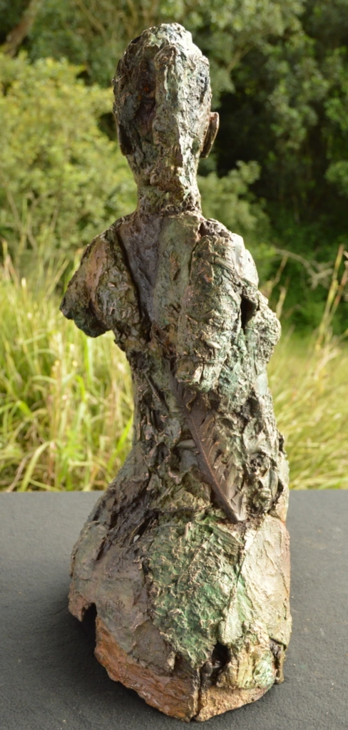 This sculpture was made from panels of wax, made from the imprints of nature; trees, forest floor, and other natural textures. If you look closely you will identify these textures. The panels are pushed gently into a mould of a figure, then cast into bronze.