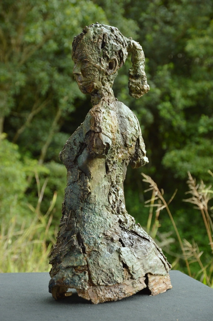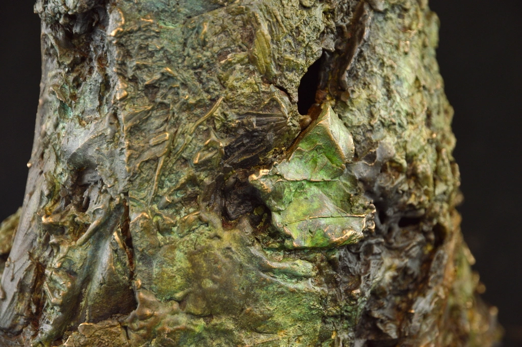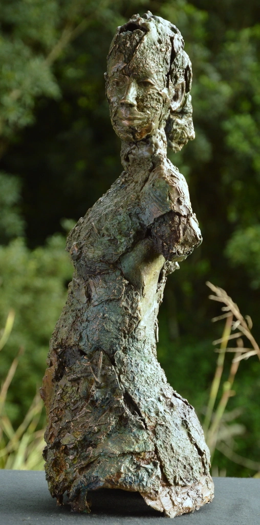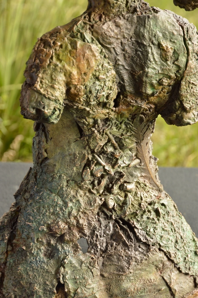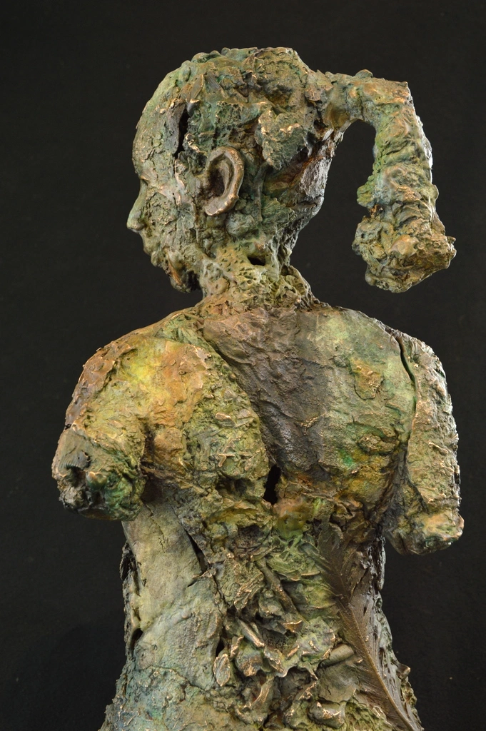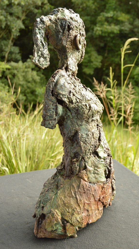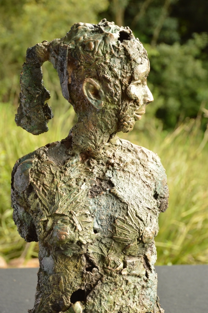 This sculpture was made from panels of wax, made from the imprints of nature; trees, forest floor, and other natural textures. If you look closely you will identify these textures. The panels are pushed gently into a mould of a figure, then cast into bronze.