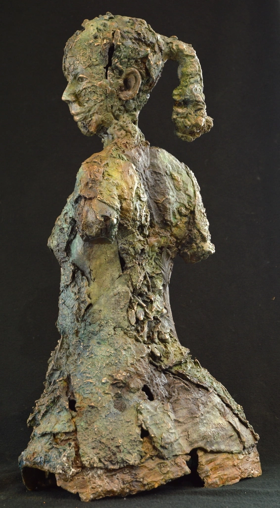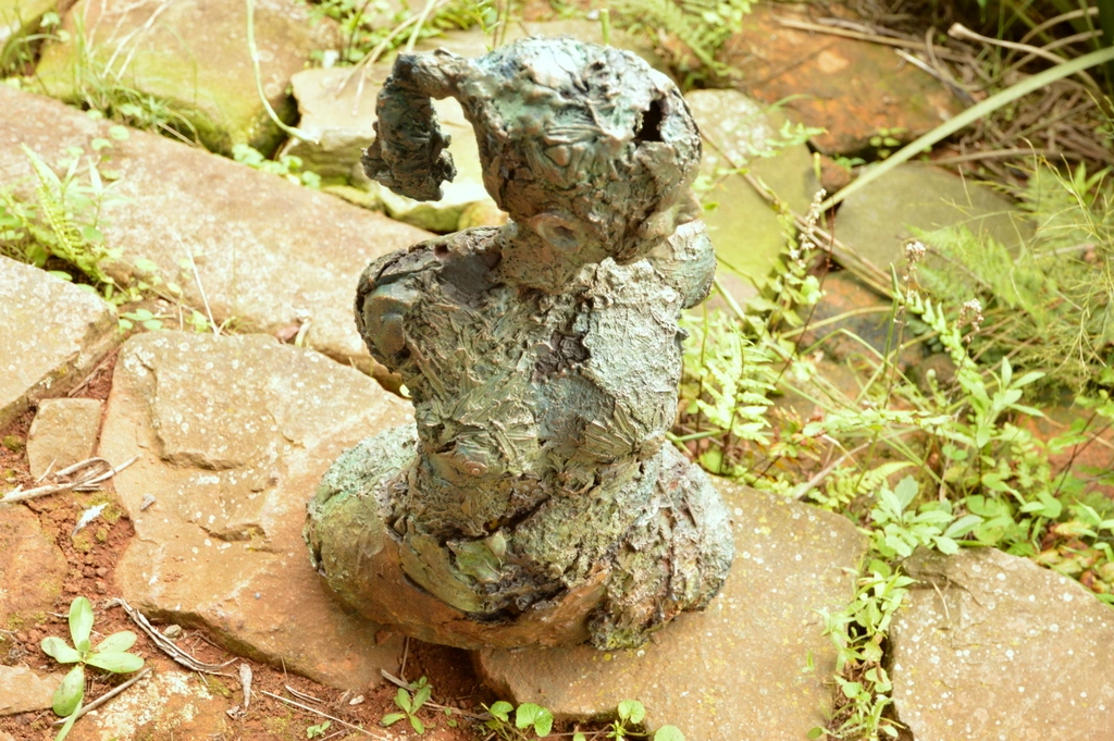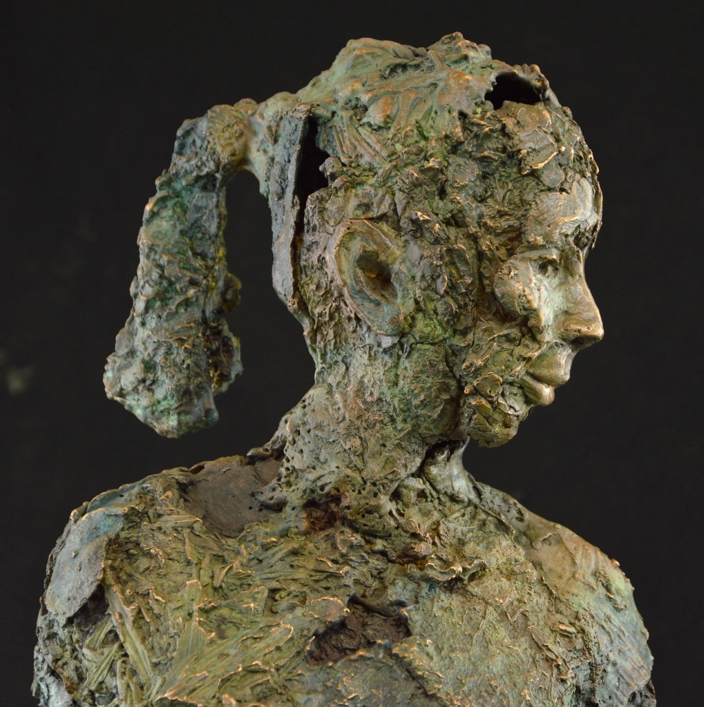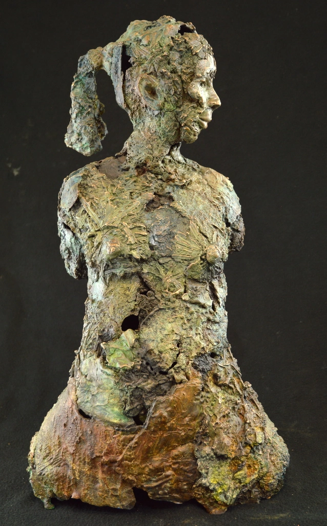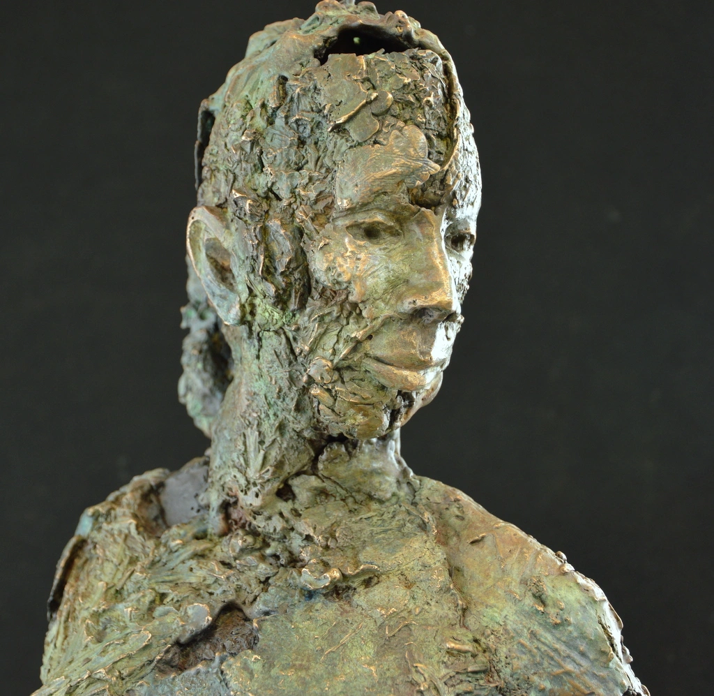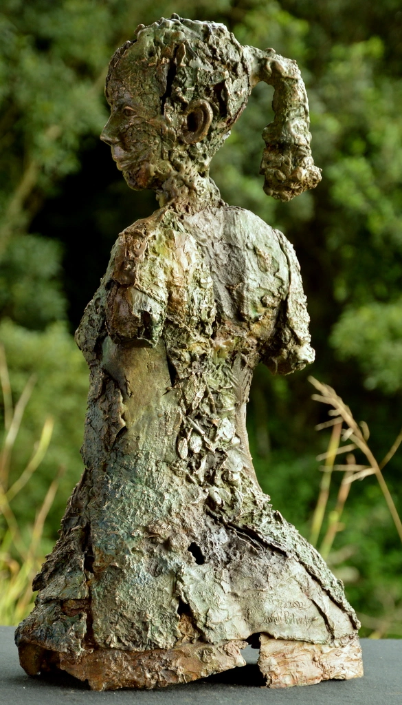This sculpture was made from panels of wax, made from the imprints of nature; trees, forest floor, and other natural textures. If you look closely you will identify these textures. The panels are pushed gently into a mould of a figure, then cast into bronze.