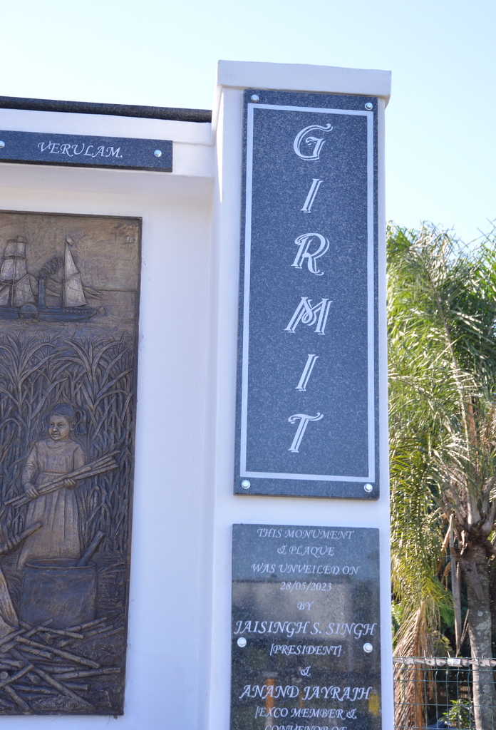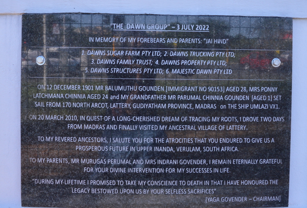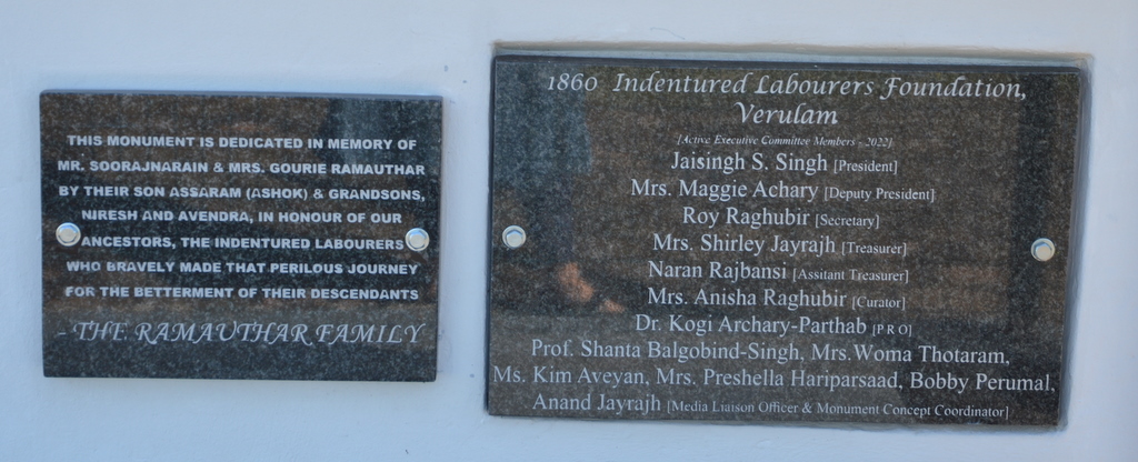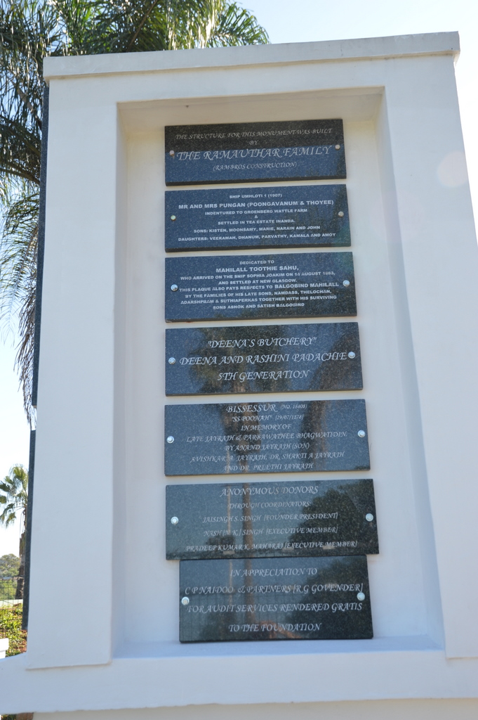 ‘This monument has been erected by the 1860 Indentured Labourers foundation, Verulam, to commemorate and honour those pioneers’.